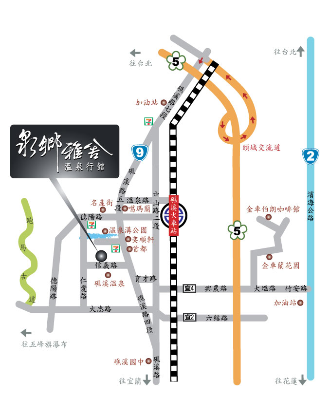 台北 → 國道五號 → 下頭城交流道 → 迴轉出交流道口,左轉礁溪路七段,台九省道 → 右轉信義路 → 泉鄉雅舍溫泉行館
